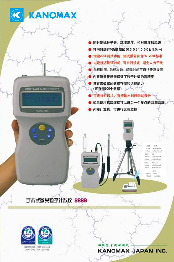 KANOMAX 3886 激光塵埃粒子計數(shù)器為日本加野麥克斯生產(chǎn)的激光粒子計數(shù)器,KANOMAX 3886激光粒子計數(shù)器同時測試粒子數(shù)、環(huán)境溫度、相對濕度和風(fēng)速,KANOMAX 3886激光粒子計數(shù)器可同時進行5通道測試,KANOMAX 3886激光粒子計數(shù)器內(nèi)置流量傳感器保證了粒子計數(shù)的高精度