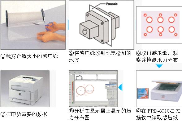 ①裁剪合適大小的感壓紙 ②將感壓紙放到你想檢測的地方 ③取出感壓紙,觀察并檢測壓力分布④在FPD-8010-E掃描儀中讀取感壓紙⑤分析在顯示器上顯示的壓力分布圖⑥打印所需要的數(shù)據(jù)