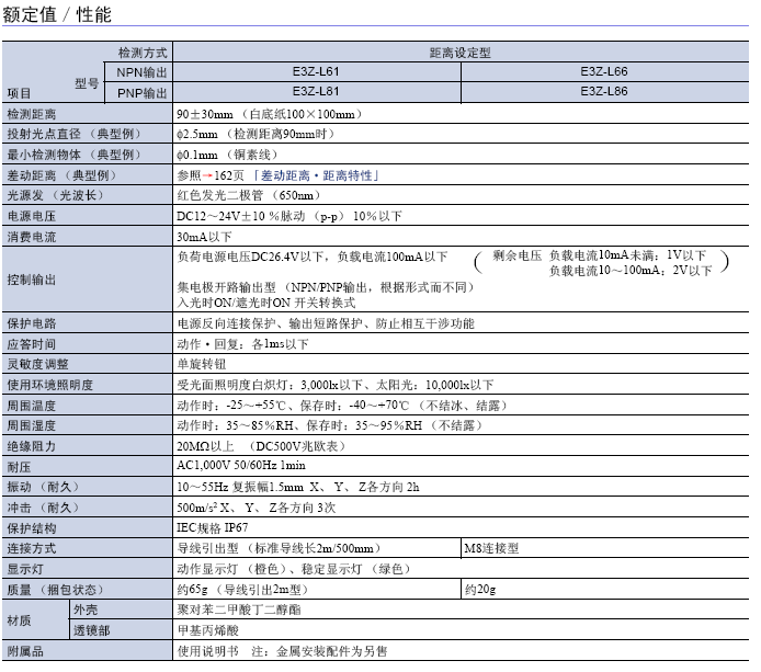 ·檢測距離: 對射型60米 回歸反射型15米 BGS型 0.3米 ·最小檢測物體: 對射型&回歸反射型 6mm(3米距離上) BGS型 0.2mm(0.3米距離上) ·響應(yīng)時間: 對射型&回歸反射型 1ms BGS型 0.5ms ·防護(hù)等級: IP67 激光等級: IEC class I ·在長距離上實(shí)現(xiàn)對小物體的檢測 ·沿用E3Z平臺,體積小巧 31*20*10.8mm , 質(zhì)量可靠 ·提供光束大小定制化服務(wù),可按照客戶要求改變光束寬度,調(diào)試更方便