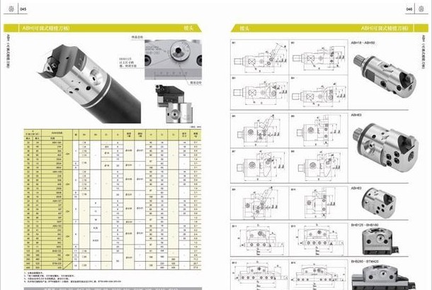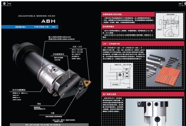 微量調(diào)整式鏜頭可調(diào)式精鏜刀柄ABH型分旋入式組合結(jié)構(gòu)(ABH18~63)、突緣式組合結(jié)構(gòu)(ABH83~BTM420)。刃尖·刀片A型:60°刀刃(刀桿)、B型:90°刀刃(刀桿)、T型:三角形刀片、C型:菱型刀片、各種類一應俱全。冷卻液噴射孔提供刃尖切削液(另行訂購)。徑方向調(diào)整螺絲。導軌:燕尾槽構(gòu)造高剛性摟緊固定方式。刀架:配換式構(gòu)造最大限度抑制損傷。